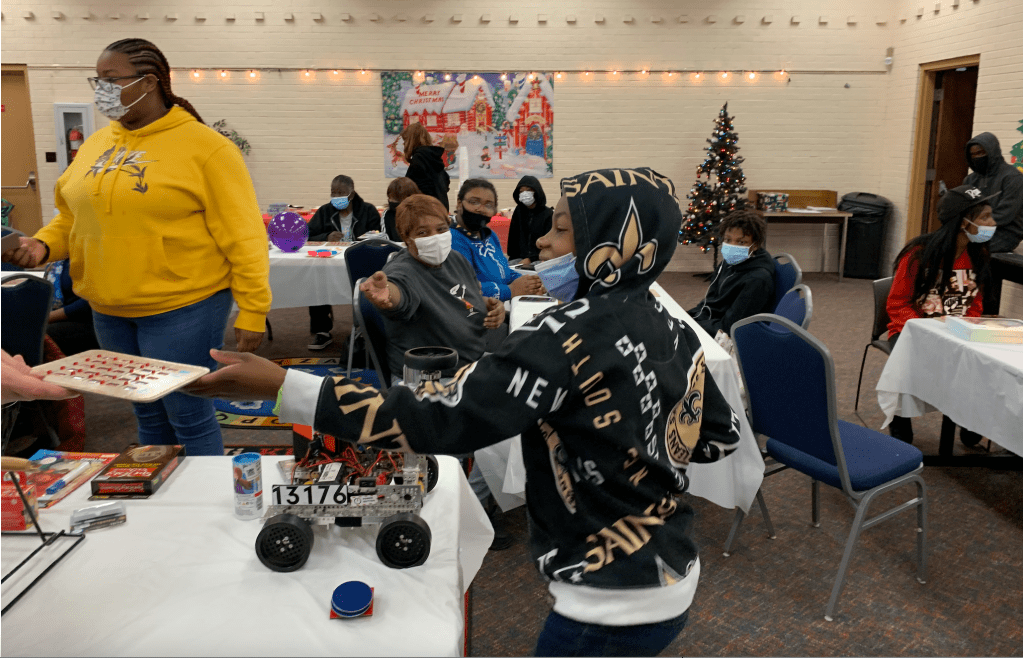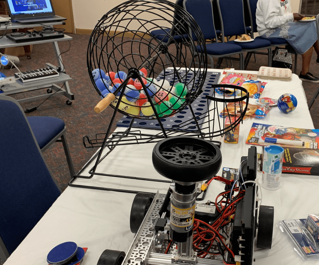 Has it really been over a month ago that we were at Megar Evers Library celebrating so merrily? Yes, it has. Thanks to everyone who helped make it happen—Jamie for the fabulous food, Miss Anne for the bingo, Cookie for the prizes. Kris for the robot demos, Emmanuel for setting up the screen for the virtual robot simulator, and more. So good to be back in person! Already looking forward to next year, and lots of celebrations at the library in between!