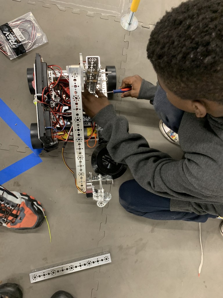 The Engineering Design Process is a big deal in robotics. It’s very important to be able to think through and solve problems—sometimes on the fly! For example, we’re getting ready for our upcoming competition in just over a week, and our robot is two inches too long. (Every bot has to be able to fit into an 18 x 18-inch cube to be able to compete).